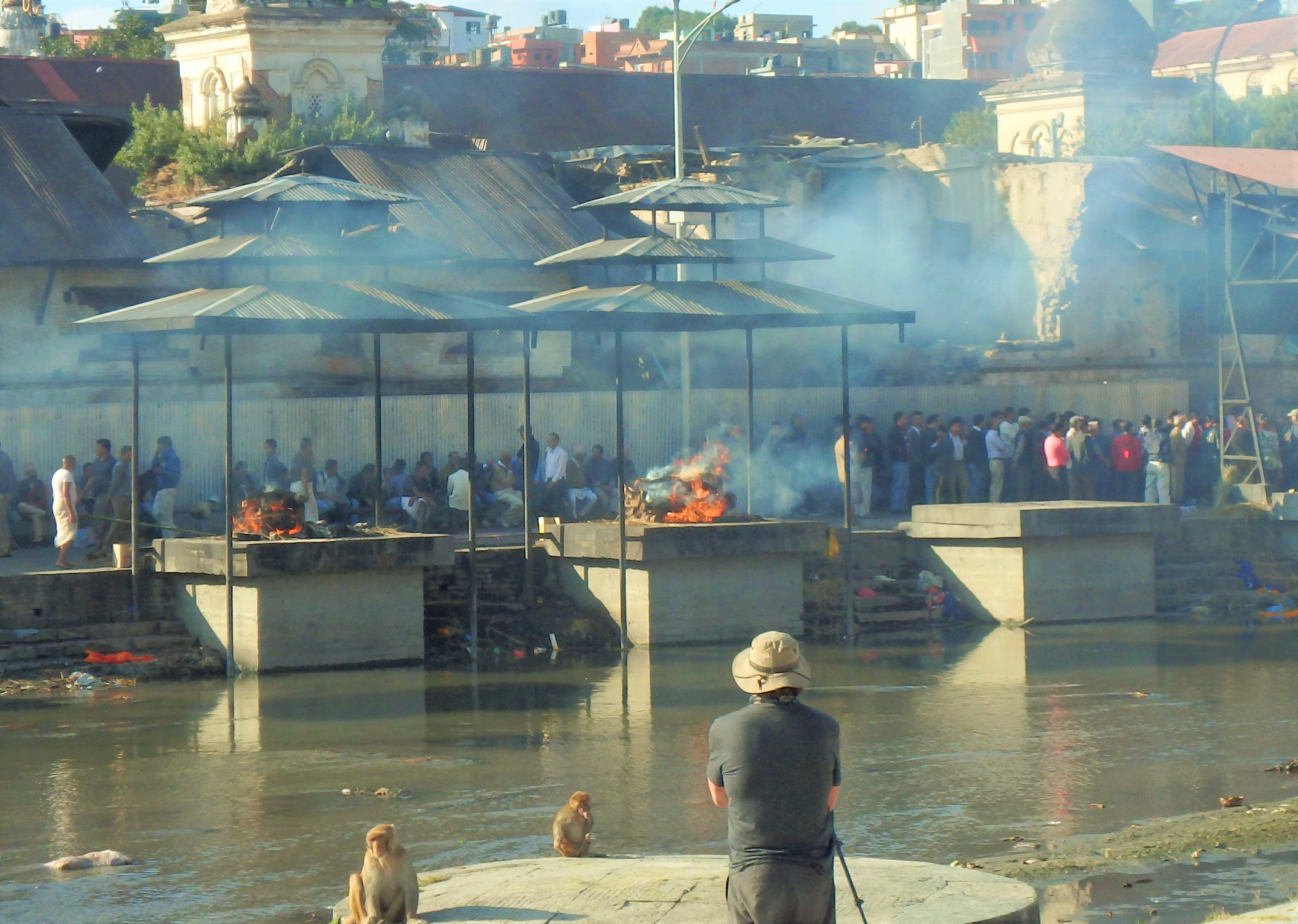 We visited the Pashupatinath Temple, a Hindu temple complex on the banks of the Bagmati river. Adult Hindu are cremated and they believe if their ashes are put in the Ganges River they’ll be freed from the cycle of reincarnation. Because the Bagmati flows to the Ganges is it considered a holy river. At this temple cremations take place daily on ghats—concrete slabs on which a pyre of wood and offerings are placed with the body. When the burning is done the ashes are swept into the river. After centuries of cremations, combined with the general lack of sanitation in poor countries, the river is quite polluted. Nonetheless beggars and impoverished people who live on the streets or around the temple use the river for washing clothes, and bathing.