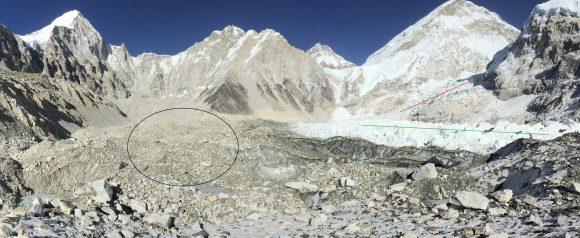 Base Camp is set up in the flat area circled in black in the center of this photo. The Khumbu Icefall, which is the first step up to Everest, follows the red line, and the Khumbu glacier follows the green line on the right.