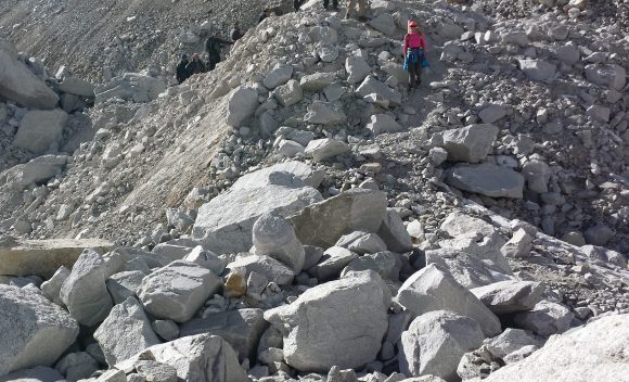 The final stretch of our walk into the area had some good rock scrambling and I asked Kat (seen on part of that trail below) about the porters that carry all the equipment, tents, supplies, electronics and more up to Base Camp. She confirmed that they are remarkable, and that part of their work is to arrive early and create enough flat space to put down tents. Many teams arrive for the short wind0w of time when climbing is best, and each set up their own campsite with tents for supplies, cooking, sleeping and communications (though I believe there is also a central comm center,) The floor of the valley changes with storms, snow slides, rockfalls, and avalanches, so the campsites may or may not remain year after year.