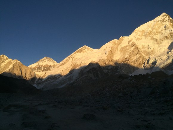 The route from Gorak Shep to Base Camp is less a trail and more just following along the Khumbu glacier. The past three days we’ve spent above treeline have been my favorite. Similarly to the way I love the desert I’ve felt energized in the starkness of the landscape, the sheer size of the land and the dichotomy of how things are always-yet-never, changing. For some reason the Khumbu glacier strikes me as particularly lovely, perhaps because it’s one of the few “living” things here; a frozen river that moves too slowly to see with our eyes. A time lapse camera caught this great video of its flow.