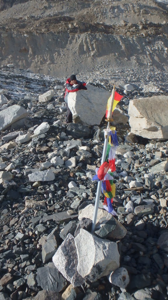 I’d forgotten that the weather window to summit Everest comes in the spring so was surprised to find the area deserted. A pile of stones strung with prayer flags marked the unofficial entrance, overlooking the Khumbu glacier and icefall, and the rocky valley floor where camp is built. After brief disappointment, the isolation and history of the area turned the moment magical.